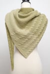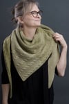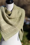 Luscious garter and cables in a slight three-colour gradient shawl. Asymmetrical triangle shawl knit sideways and designed so the knitter can use as much of their yarn as possible. Both written and charted instructions are included in the pattern