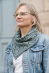 Notes: Asymmetrical cowl, knit sideways and shaped using increases. Must be seamed. Lace comes with rest rows.