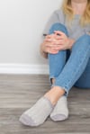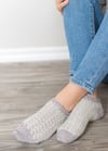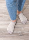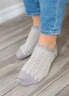Yarn: 200-250 yds / 183-228 m sock yarn that achieves gauge. Sample knit in Super Sock by Riverside Studio in Ghost, Size Small. Toes and heels knit in Geronimo Sock by Hey Sister Yarn Co.